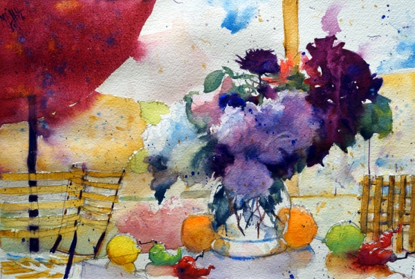 Aquarelle "Bouquet au parasol rouge" André Mehu